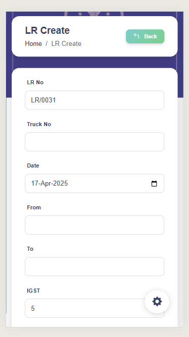 You can create an LR with just one click. The system automatically generates the LR number and date. You only need to enter details like From-To locations, Consignor and Consignee GST numbers, number of packages, goods particulars, E-Way Bill number, weight (in tons), and rate.